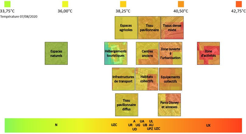 Val d’Europe Agglomération est une intercommunalité atypique connaissant un développement important depuis l’implantation des Parcs Disney. Ce territoire d’ile de France à l’est de Paris, a connu l’une des plus fortes dynamiques démographiques et socio-économiques de France de ces dernières années, et compte actuellement environ 35 000 habitants pour autant d’emplois. Le territoire reçoit près de 40 millions de visiteurs répartis entre les parcs Disney, le centre commercial, La Vallée Village et Villages Nature-Paris. Cette intercommunalité qui comptait à l’origine 5 communes en compte aujourd’hui 10. Soumis aux (ICU), le territoire souhaite lancer des études et des expérimentations pour identifier et réduire ce phénomène. ÎLÕ et Nepsen ont ainsi établi un diagnostic précis des ICU et des IFU, à partir de : cartographie satellite infrarouge, mesures in situ (capteurs de températures et d’humidité), photographies infrarouge du territoire, mesures de température à vélo, mesures de températures ressenties avec un thermomètre à boule noire. Ce diagnostic ainsi le croisement avec les zonages PLUi ainsi que le patrimoine arboré ont permis d'aboutir à la définition et à la priorisation de 27 zones à enjeux.
